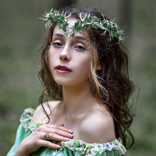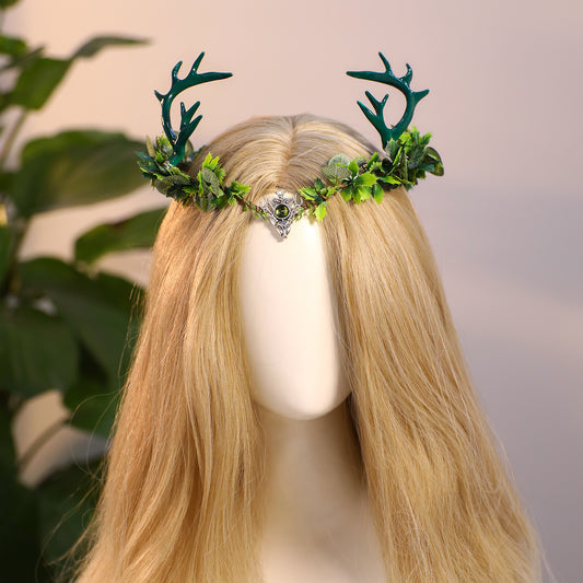 Green Woodland Antler Crown - Handmade Floral Fairy Headpiece Forest Elf Tiara