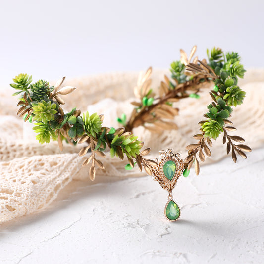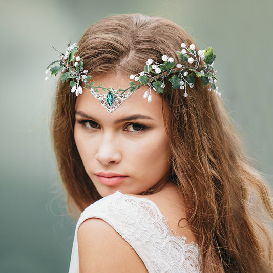 Green Flower Crown Headpiece: Wedding Forest Leaf, Crystal Fairy
