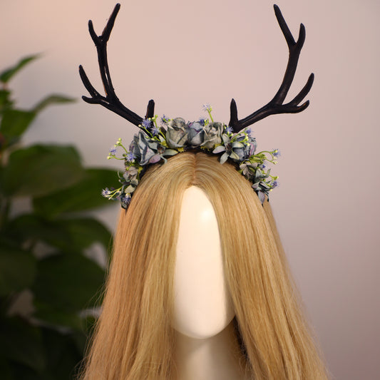 Handmade Black Flower Antler Headband - Woodland Floral Reindeer Headpiece