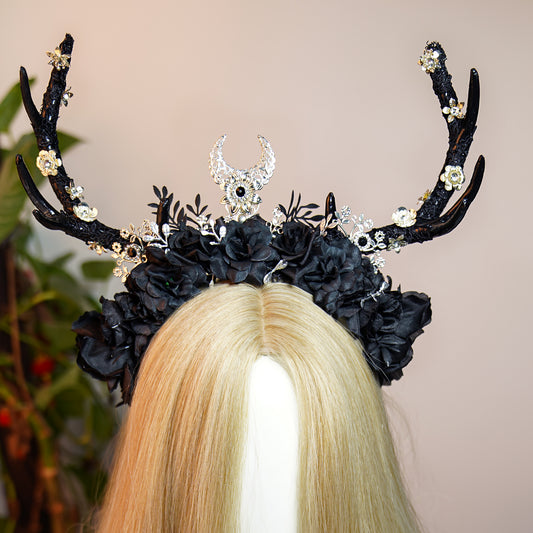 Handmade Black Antler Headband - Gothic Reindeer Headpiece Flower Dark Horns