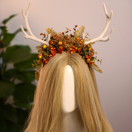Handmade Orange Woodland Antler Headband - Reindeer Flower Headpiece