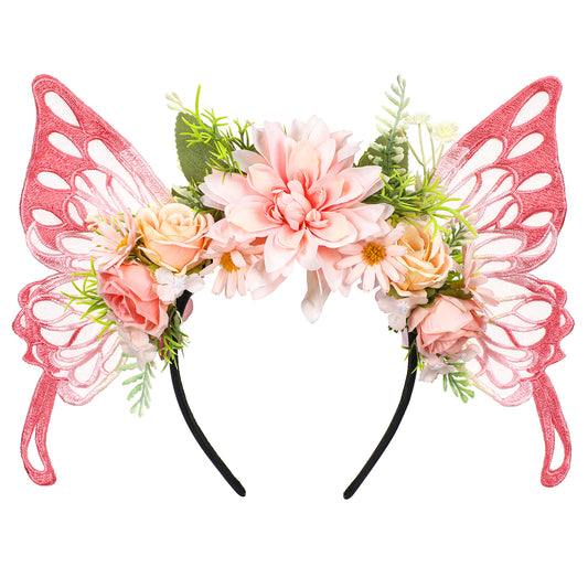 Pink Butterfly Fairy Crown - Flower Headband with Wings Woodland Floral Hairband Forest Elf Headpiece for Women