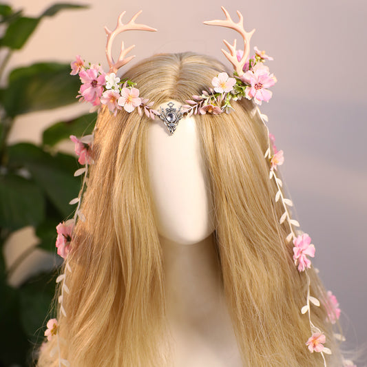 Pink Fairy Antler Headpiece - Handmade Elf Flower Crown Woodland Floral Circlet