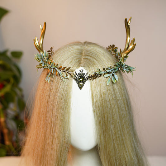 Antler Fairy Crown Gold: Green Leaf Headpiece